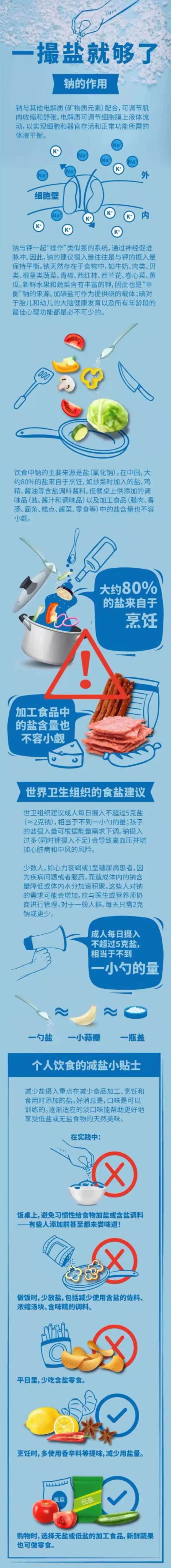 世卫组织建议******每日食盐量不超过5克,以促进血压健康,降低心脏病和中风的患病风险。数据显示,中国人均每日烹调用盐9.3克,几乎是推荐摄入量的两倍!